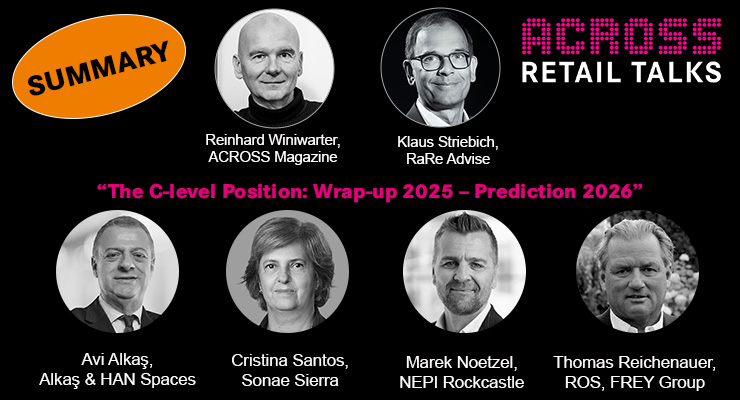 As the year 2025 is nearing it’s end, ACROSS invited four industry leaders – Avi Alkaş (Alkaş & HAN Spaces), Cristina Santos (Sonae Sierra), Marek Noetzel (NEPI Rockcastle), and Thomas Reichenauer (ROS Retail Outlet Shopping / FREY Group) – to a final Retail Talk. To evaluate the retail and placemaking industry’s past 12 months and to give an outlook of what’s next.